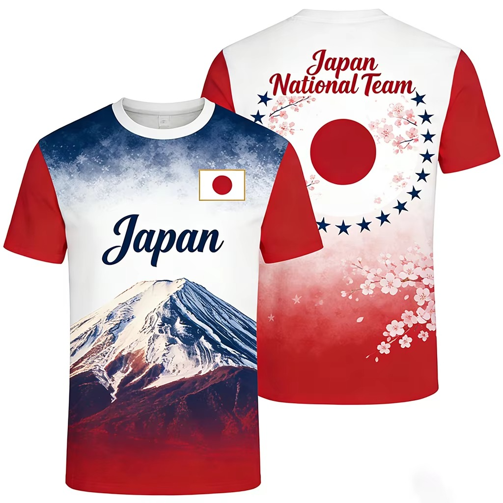 Our artful Japan T-shirt is a masterpiece of dual-sided storytelling. The front features a breathtaking, detailed portrait of Mount Fuji on the lower half, set against a calm blue-to-white sky gradient with elegant cursive 'Japan' text and the national flag. Turn around, and the back is a stunning celebration of Japanese national identity: the cursive 'Japan National Team' branding at the top is framed by a graceful ring of stars and delicate pink sakura (cherry blossoms), with the large, large Hinōmaru circle at its heart.