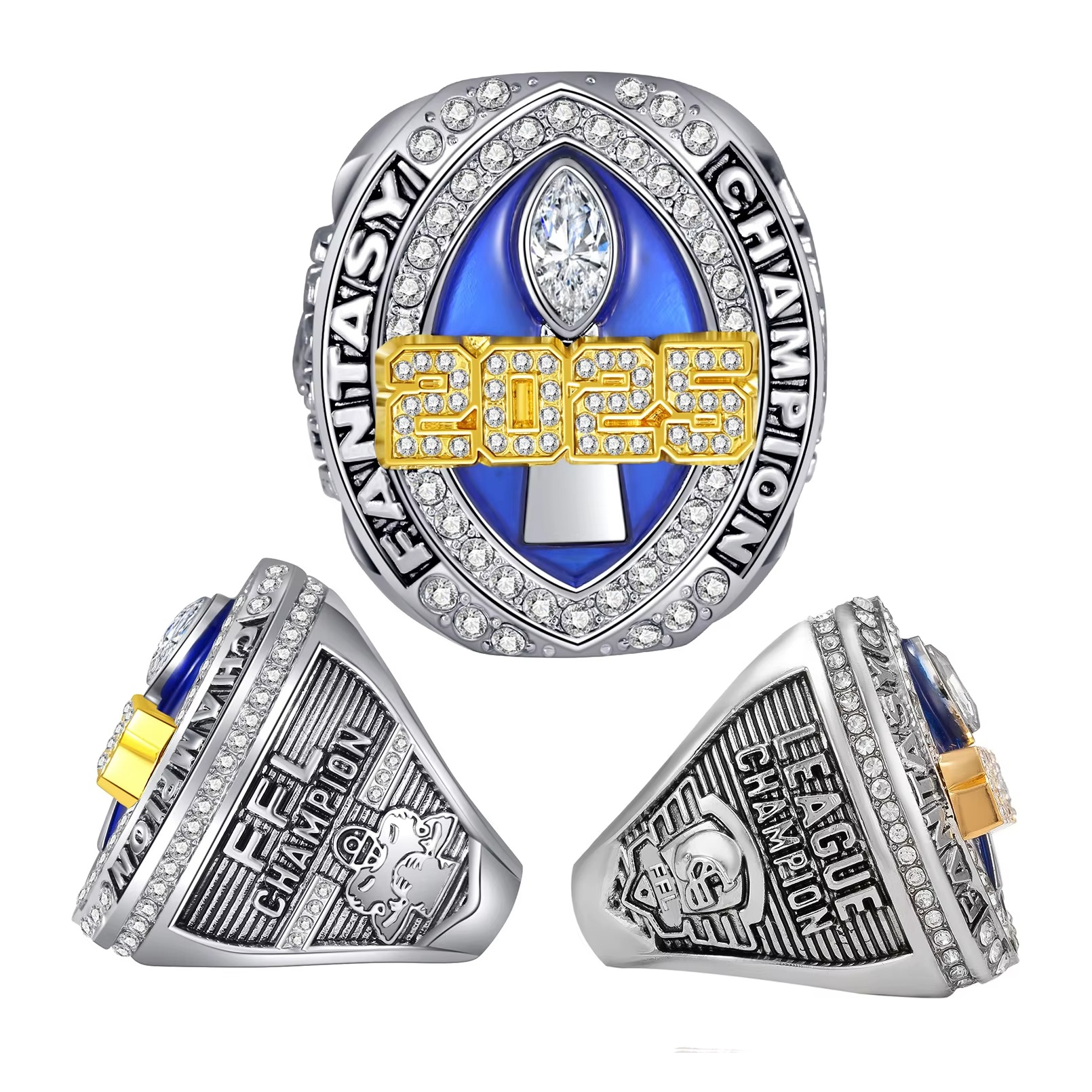 Front and Center: The ring boasts a bold, silver-toned shield encrusted with brilliant Cubic Zirconia stones. The deep blue enamel centerpiece features the year "2025" in glittering gold-plated diamonds, set against a backdrop shaped like a football. The bezel proudly proclaims "FANTASY CHAMPION."