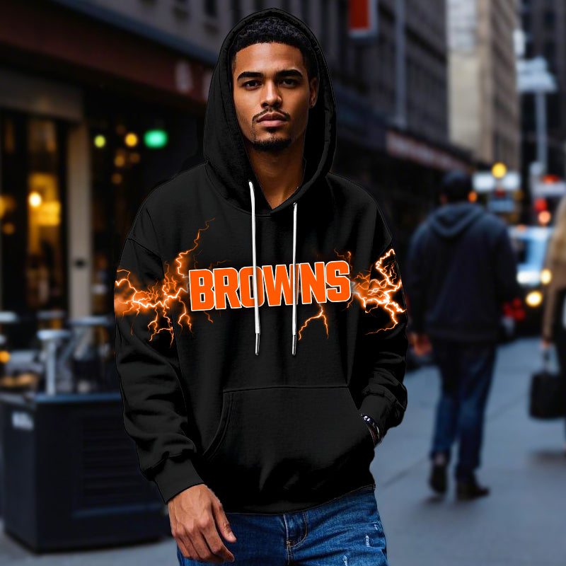 This Men's Black Cleveland Browns Hoodie features a unique Lightning graphic incorporating the team name on the front and a super cool cartoon-style graphic of the team mascot combined with the city name on the back. Plus, the kangaroo pocket is perfect for keeping your essentials close and secure! It's a fantastic way to display your support for your favorite team while staying comfortable.
