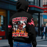 This Men's Black Kansas City Chiefs Hoodie features a unique Lightning graphic incorporating the team name on the front and a super cool cartoon-style graphic of the team mascot combined with the city name on the back. Plus, the kangaroo pocket is perfect for keeping your essentials close and secure! It's a fantastic way to display your support for your favorite team while staying comfortable.