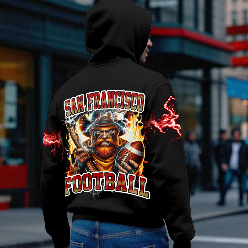 This Men's Black San Francisco 49ers Hoodie features a unique Lightning graphic incorporating the team name on the front and a super cool cartoon-style graphic of the team mascot combined with the city name on the back. Plus, the kangaroo pocket is perfect for keeping your essentials close and secure! It's a fantastic way to display your support for your favorite team while staying comfortable.