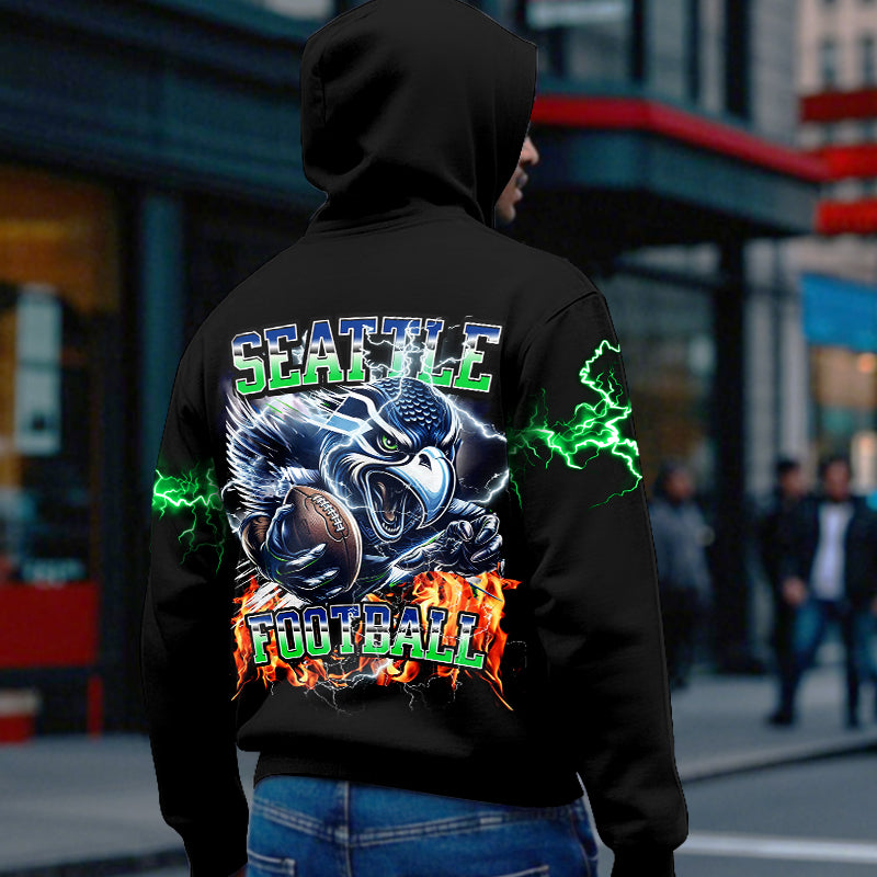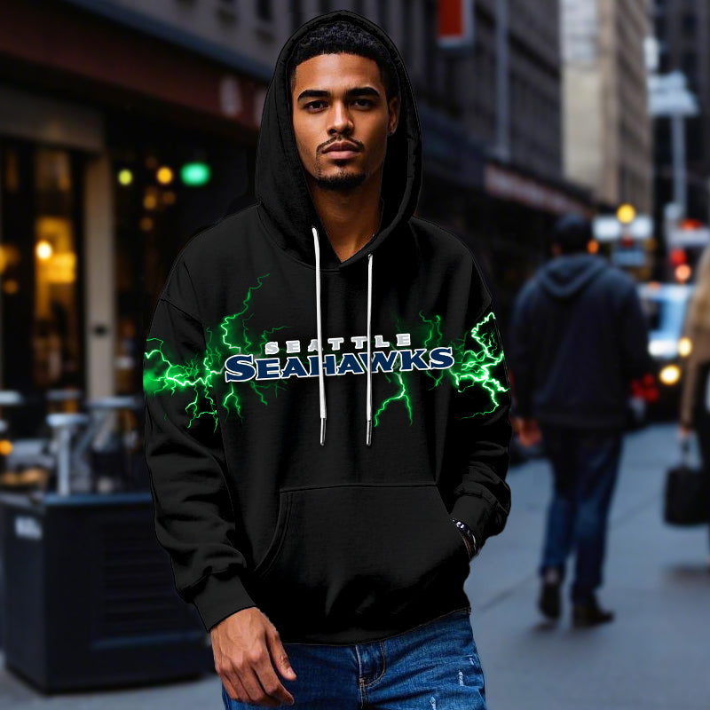 This Men's Black Seattle Seahawks Hoodie features a unique Lightning graphic incorporating the team name on the front and a super cool cartoon-style graphic of the team mascot combined with the city name on the back. Plus, the kangaroo pocket is perfect for keeping your essentials close and secure! It's a fantastic way to display your support for your favorite team while staying comfortable.
