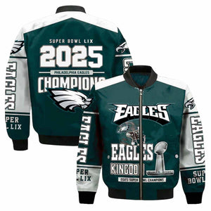 Celebrate the Philadelphia Eagles' Super Bowl LIX victory in style with this championship jacket. The front boasts the team name, iconic logo, and Super Bowl trophy, while the back proudly displays "2025 EAGLES CHAMPIONS." Show your team unity and pride with the "EAGLES KINGDOM" phrase. Expertly crafted for devoted fans like you.